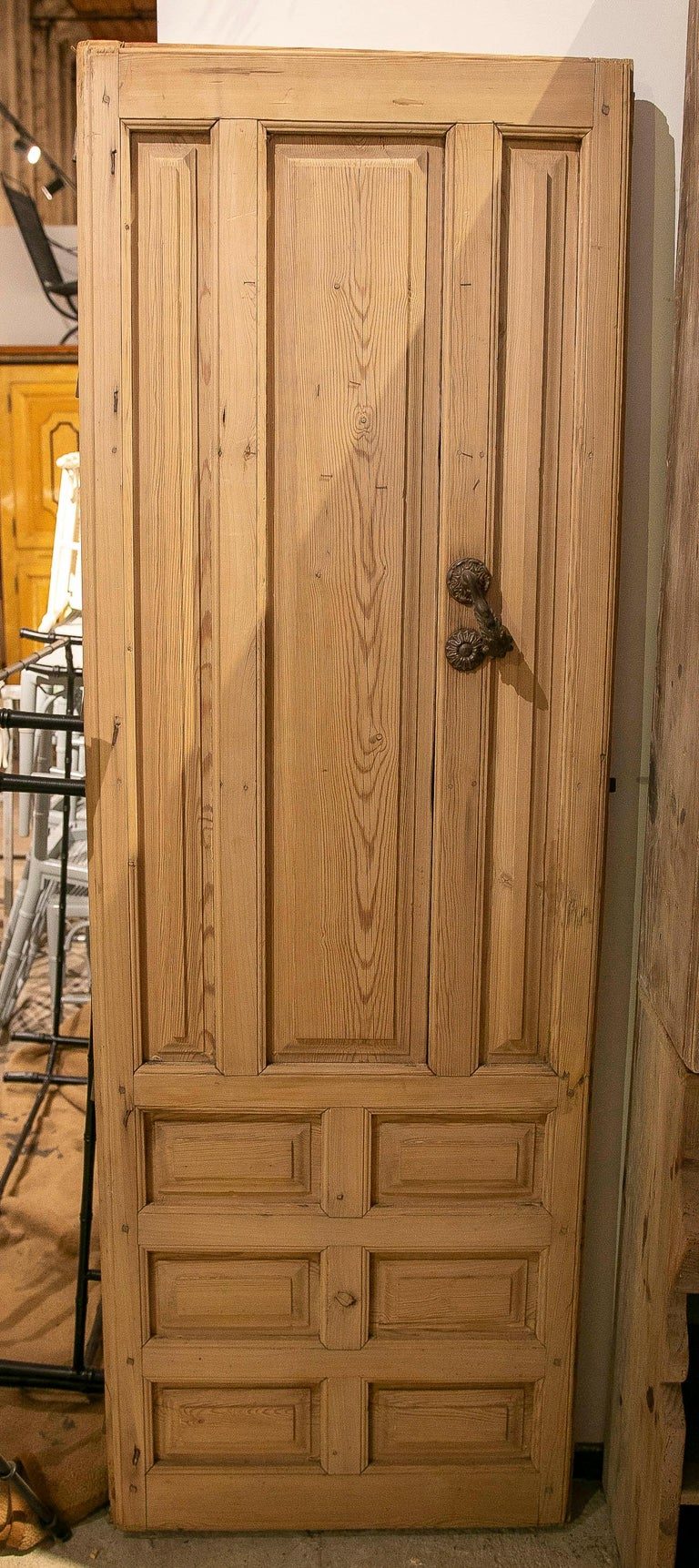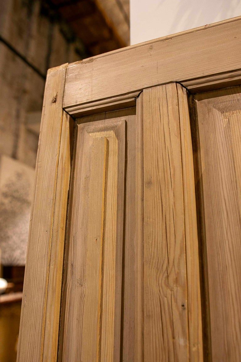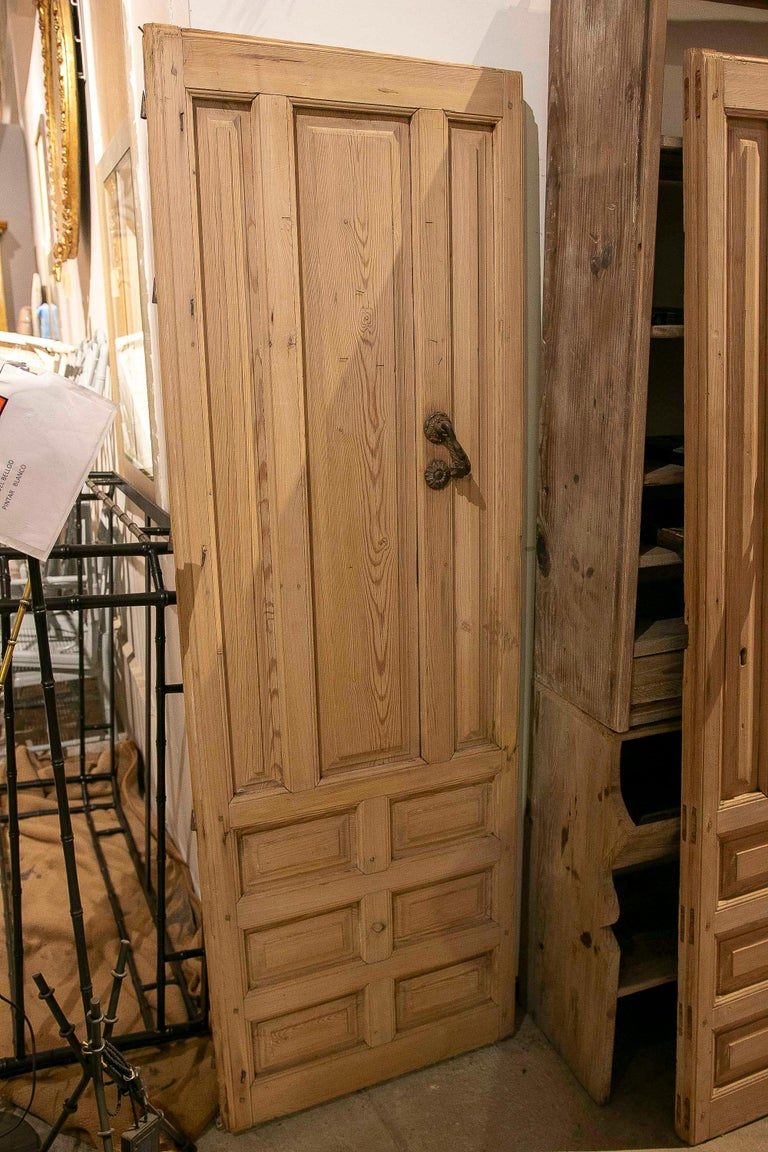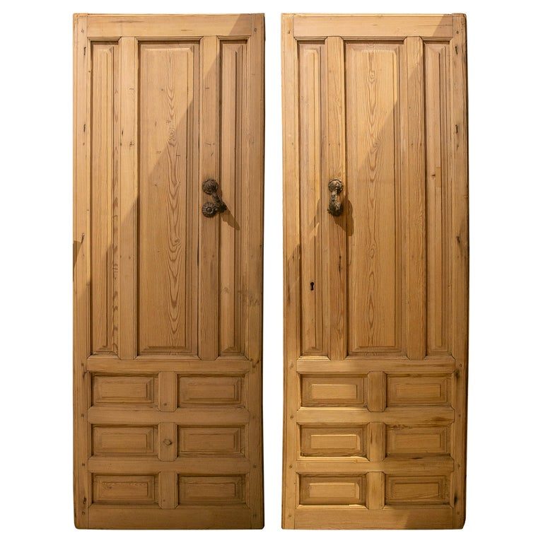 Pareja de Puertas Antiguas de Madera de 1875 con Paneles Tallados y Aldaba de Hierro